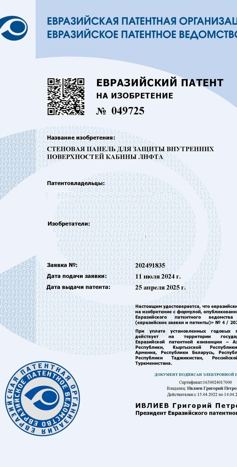 Стеновая панель (чехол) для защиты внутренней поверхности лифта - это запатентованное Решение ЕВРАЗИЙСКОЙ ПАТЕНТНОЙ ОРГАНИЗАЦИЕЙ. Действие патента распространяется на все страны входящие в Евразийский экономический союз. Любое копирование способа защиты внутренней отделки лифта панелями (чехлами) нарушает исключительные права правообладателя и будет преследоваться как в рамках гражданского, так уголовного законодательства стран входящих в ЕЭС