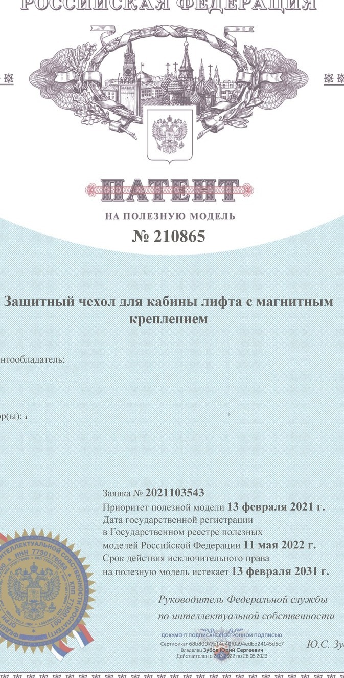 Уважаемые клиенты, в Российской Федерации появились компании, которые копируют ЗАПАТЕНТОВАННЫЙ способ защиты лифта панелями (чехлами), что подвергает Вас опасности.